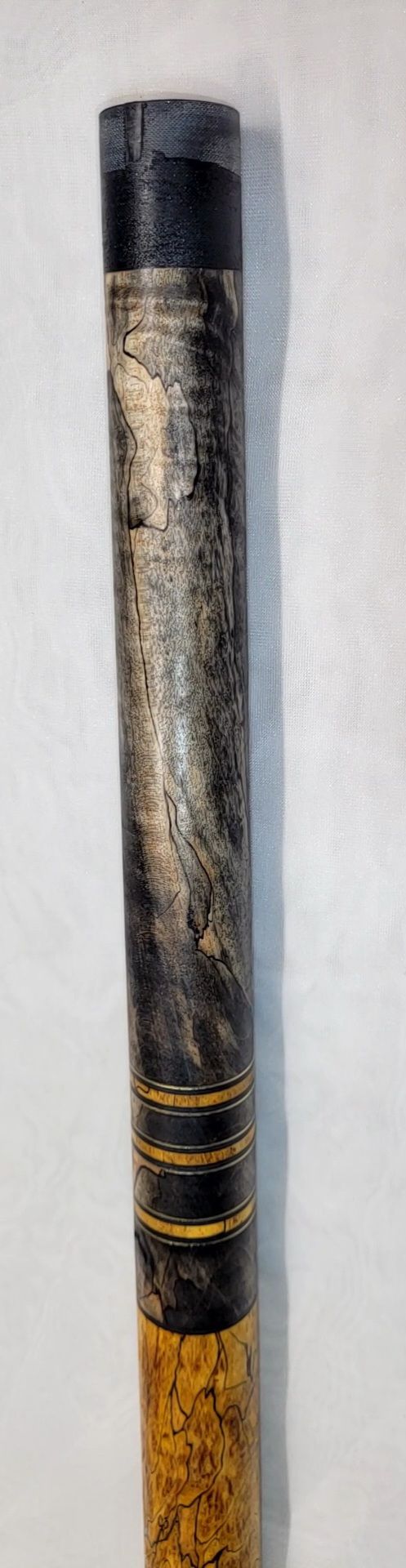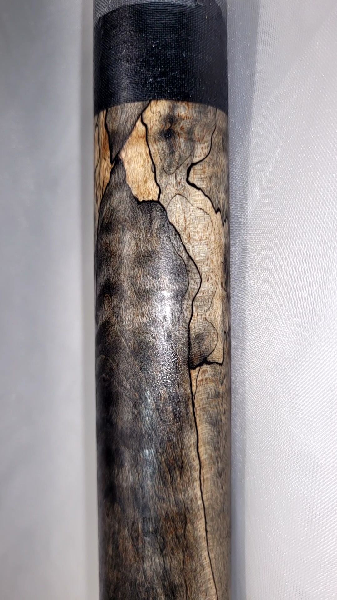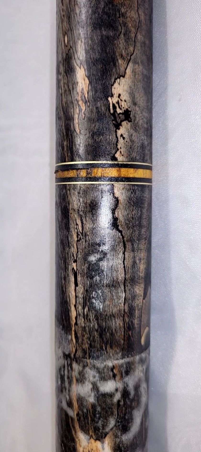 Most all of my butts contain spalted and stabilized wood. I harvest rotting wood from around where I live in western PA, dry it to zero percent humidity, and stabilize with Cactus Juice resin. The resulting material is significantly more dense than the original wood was — that’s why I can use a soft wood like walnut or cherry (on other sticks; this one’s all maple on a honey locust core) and have it produce a hit like purple heart or some other dense wood.