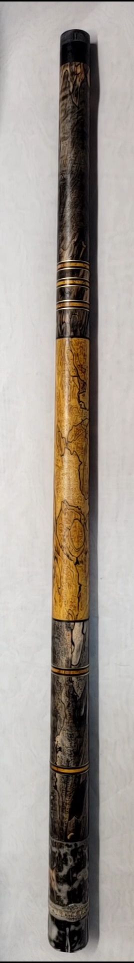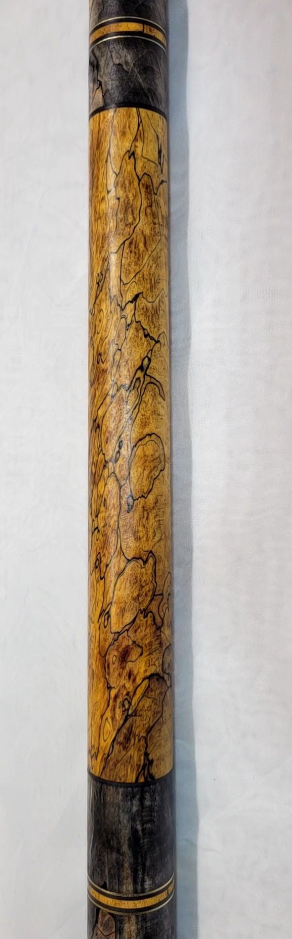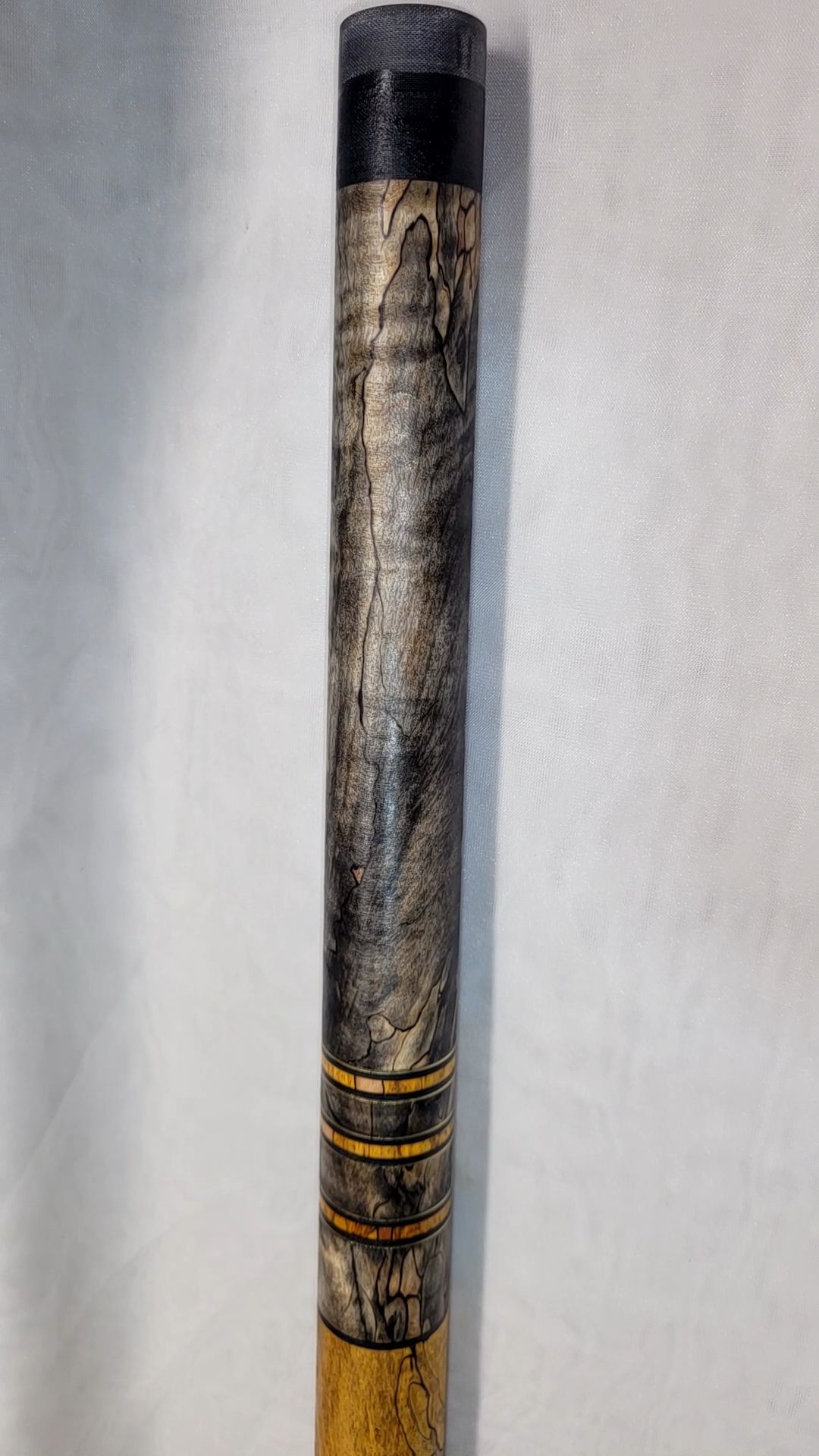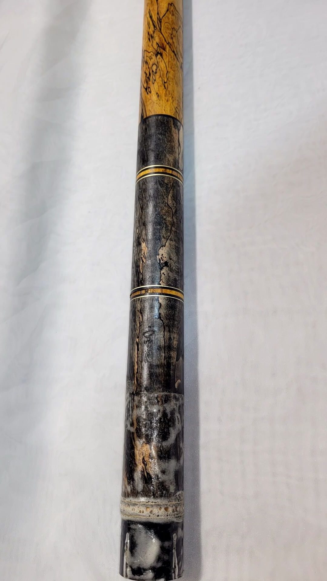Most all of my butts contain spalted and stabilized wood. I harvest rotting wood from around where I live in western PA, dry it to zero percent humidity, and stabilize with Cactus Juice resin. The resulting material is significantly more dense than the original wood was — that’s why I can use a soft wood like walnut or cherry (on other sticks; this one’s all maple on a honey locust core) and have it produce a hit like purple heart or some other dense wood.