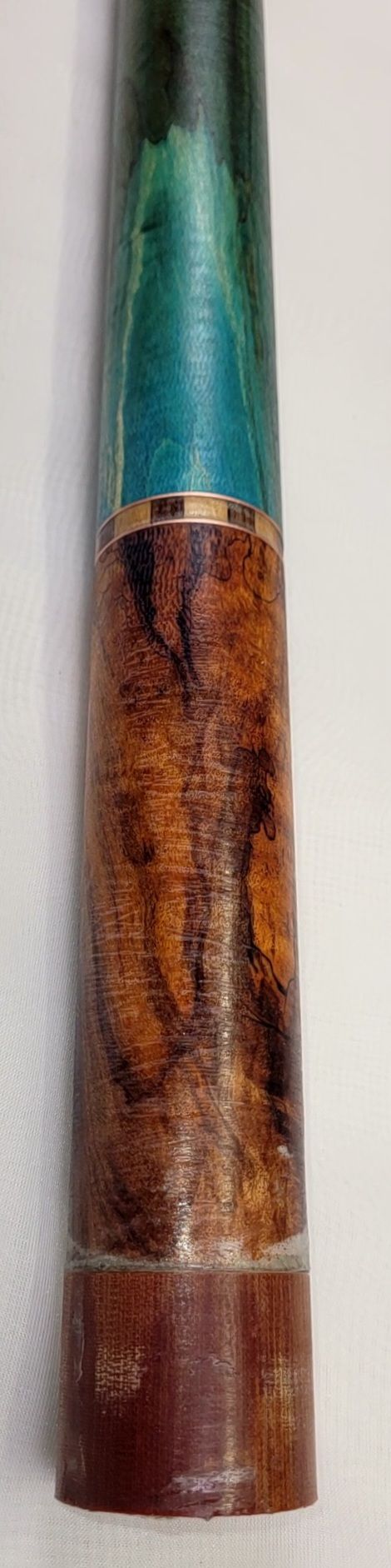 This butt has a purple heart core. Add a purple heart, osage orange, or hickory shaft if you want a break monster. Add a carbon fiber or BurcHowdy Black Birch shaft if you want low deflection and massive control. And if you want regular wood, consider any of my regular shaft species, but pay close attention to black birch. It’s stronger, stiffer, has more crushing force, and is slightly lighter than hard maple. Better English. Better control.