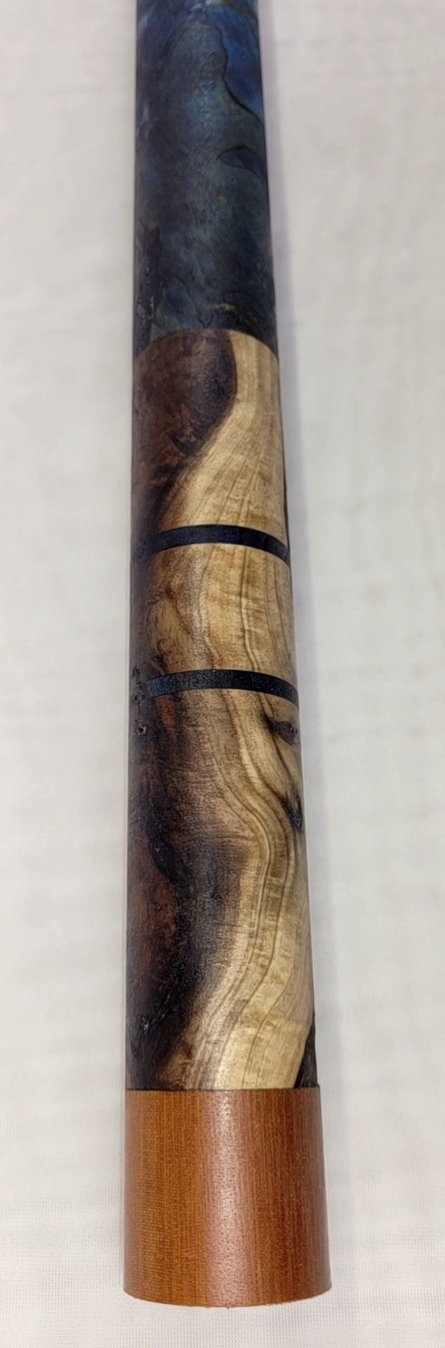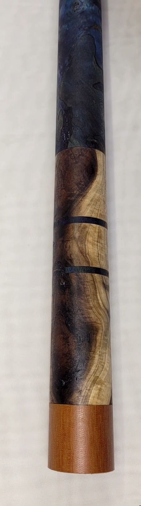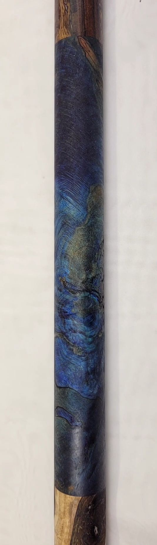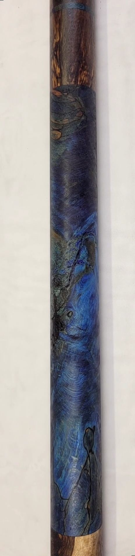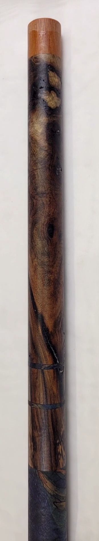 Spalted/Stabilized walnut and hard maple on full length beech core with copper rings. Spalted wood that is stabilized with Cactus Juice resin often has a density approaching purple heart. Walnut is usually considered to soft/light for cue building, which is why it is seldom seen. However, this is spalted/stabilized walnut, which picks up density in the process.