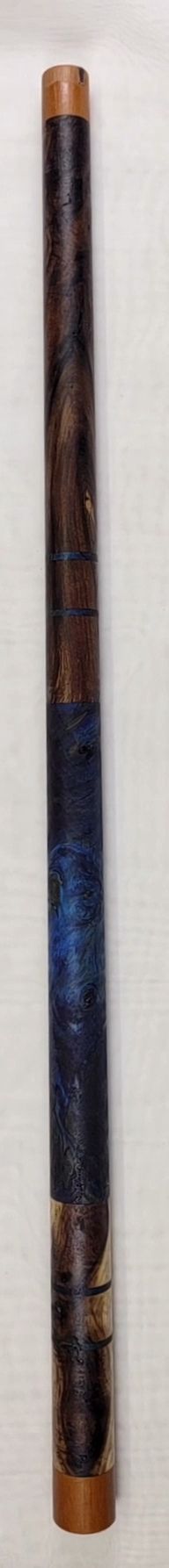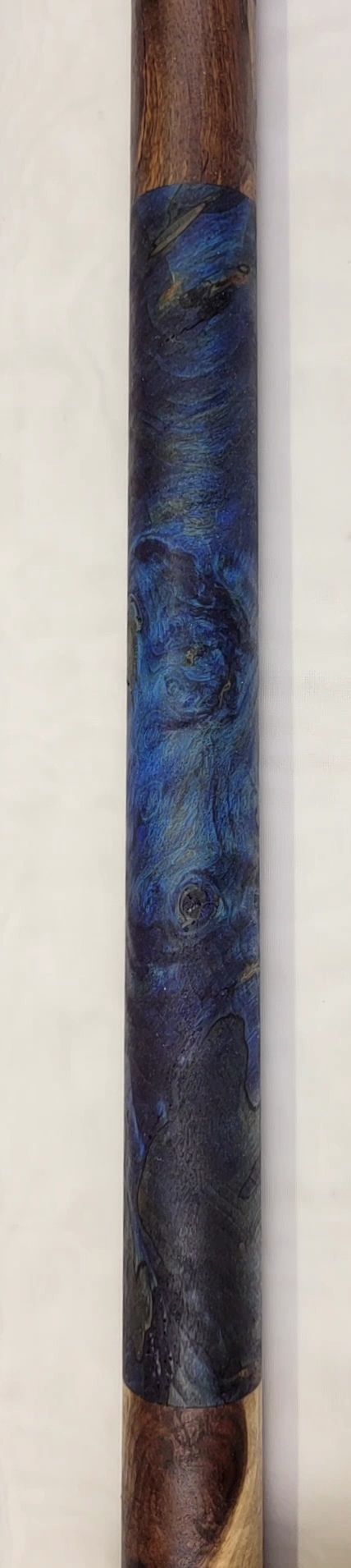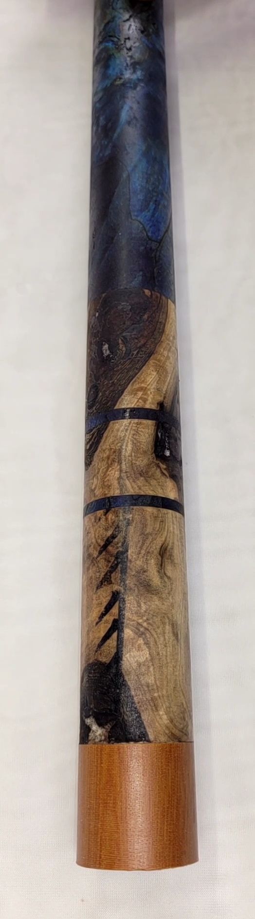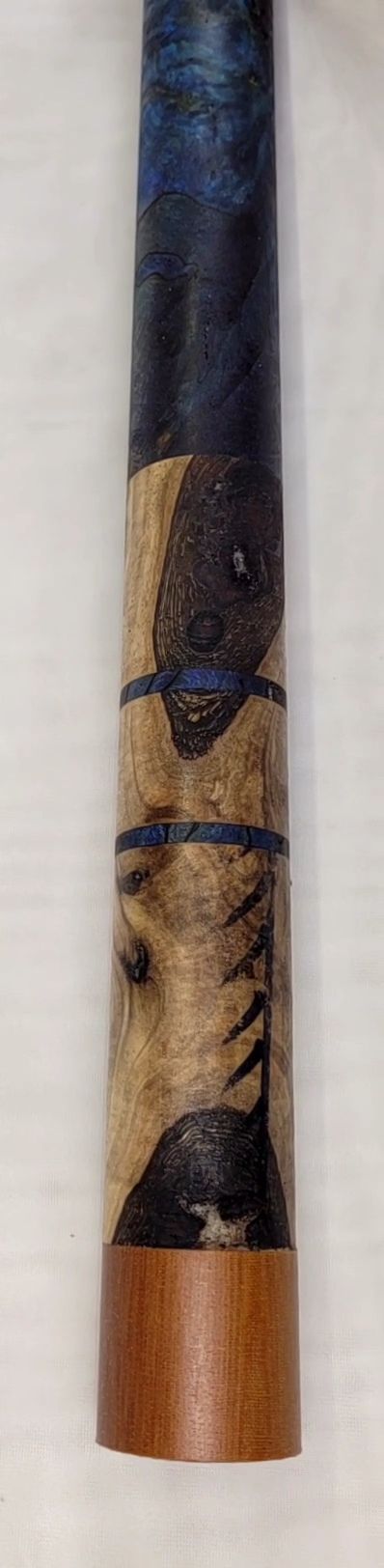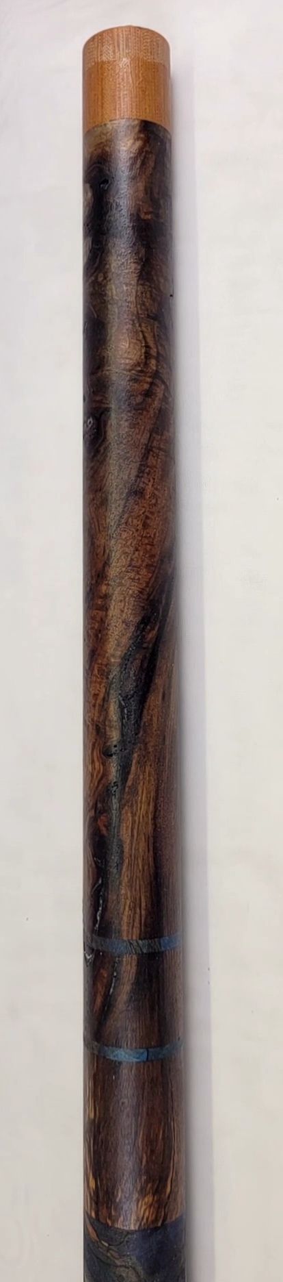 Spalted/Stabilized walnut and hard maple on full length beech core with copper rings. Spalted wood that is stabilized with Cactus Juice resin often has a density approaching purple heart. Walnut is usually considered to soft/light for cue building, which is why it is seldom seen. However, this is spalted/stabilized walnut, which picks up density in the process.
