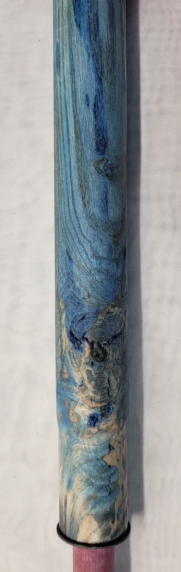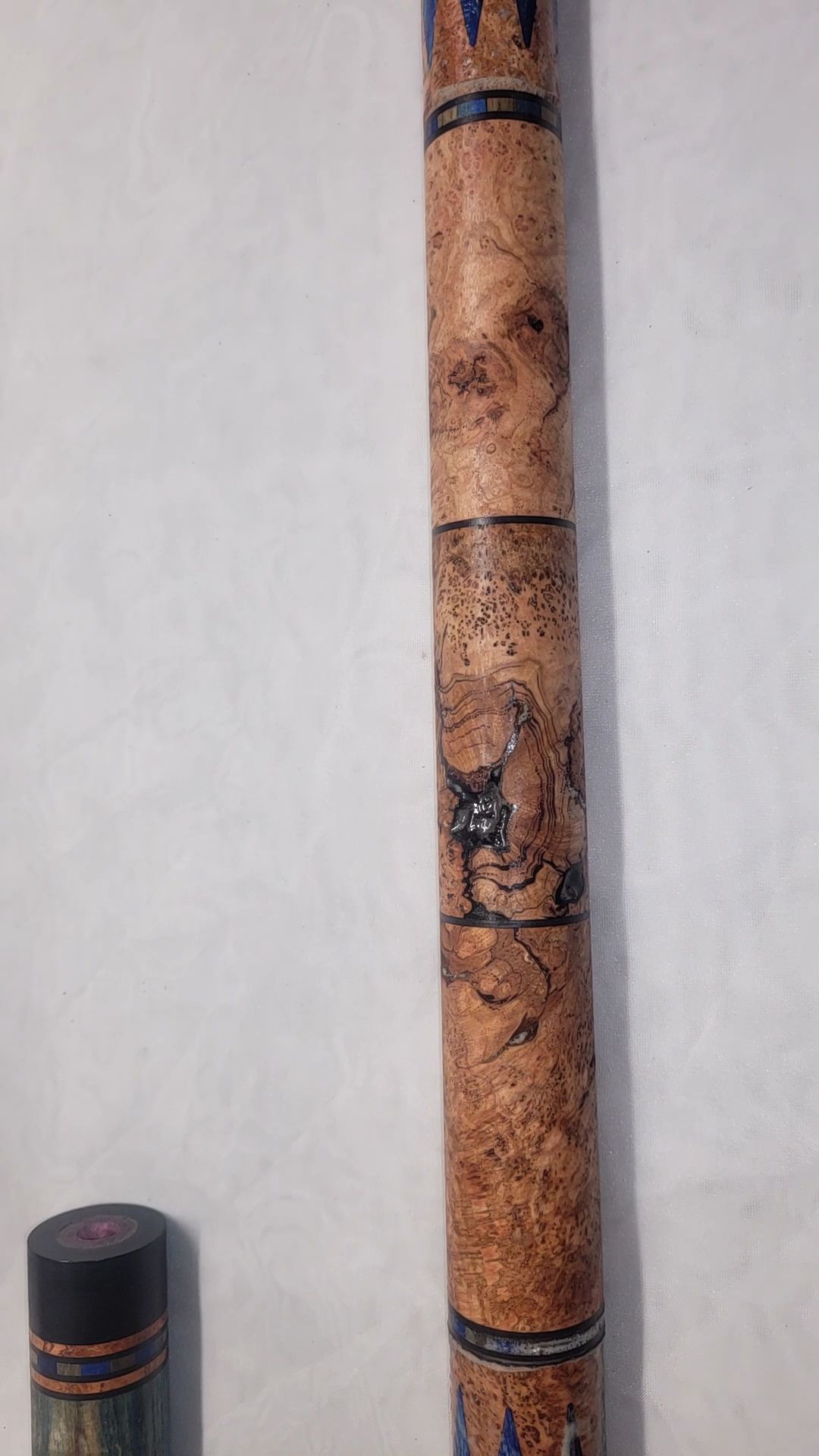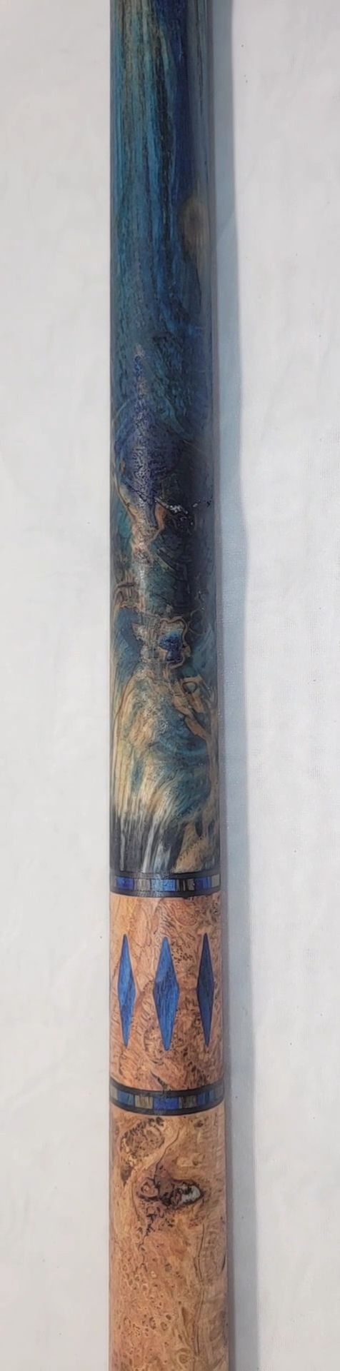 Images show gaps on either side of the burl handle. These will be filled with 1 1/2″ black rings with 1/2″ burl rectangle slots, sandwiched between electric blue and black or white slot rings. Images also show 6″ extension that is not yet cut to size.