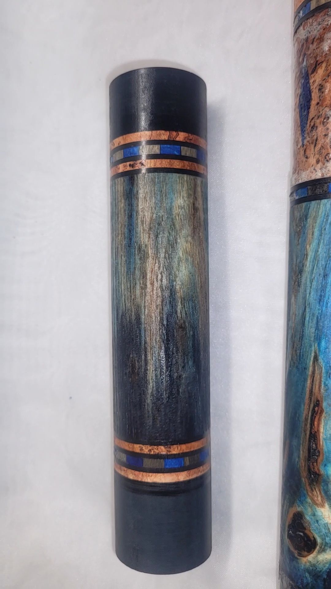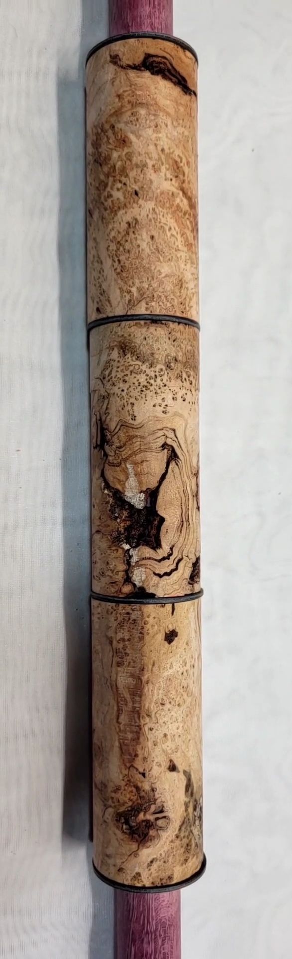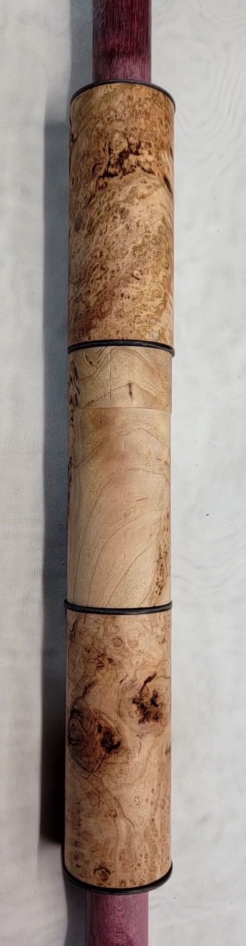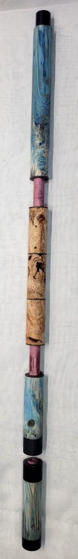 Images show gaps on either side of the burl handle. These will be filled with 1 1/2″ black rings with 1/2″ burl rectangle slots, sandwiched between electric blue and black or white slot rings. Images also show 6″ extension that is not yet cut to size.