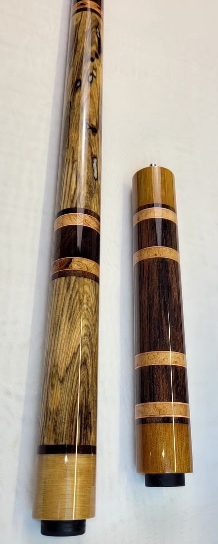 I made my second limited edition batch in response to a request that I do more out of non-dyed stabilized wood. All of the Beatitudes butts began as a single piece of spalted wood long enough to be both a forearm and butt sleeve. Some were long enough to also offer an extension as an add on, if wanted. The Beatitudes Limited Edition have product numbers from LE149 to LE156. The grain in each contiguous piece is aligned even when the pieces are not contiguous, as when there is a ring set or handle in between. All of the designs were dictated by the wood itself, as my cuts were placed where I could get the straightest sections to work with.