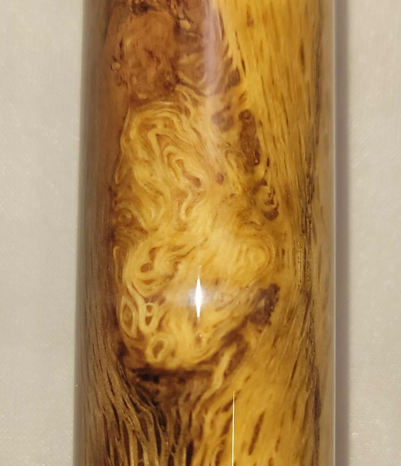 Woods used in the batch: Oak, maple, apple, walnut, yellow birch, black birch burl, black cherry red rot, and of course, all on shagbark hickory cores. I harvest rotting wood from around where I live in western PA, dry it to zero percent humidity, and stabilize with Cactus Juice resin. The resulting material is significantly more dense than the original wood was — that’s why I can use a soft wood like walnut or cherry and have it produce a hit like hard maple or some other dense wood.